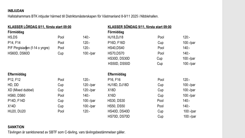 DISTRIKTSMÄSTERSKAP HALLSTAHAMMAR SISTA ANMÄLAN 26 OKTOBER – GRATIS FÖR ALLA I BTK KUNGSÖR