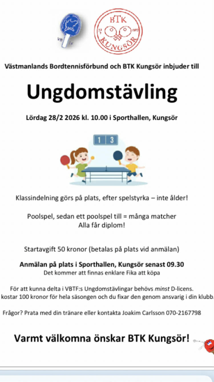 BTK Kungsör hälsar alla välkomna till våran ungdomstävling! Vi kommer ha hembakat fika på plats. Huvudtränare Martin och Jocke håller i tävlingen!